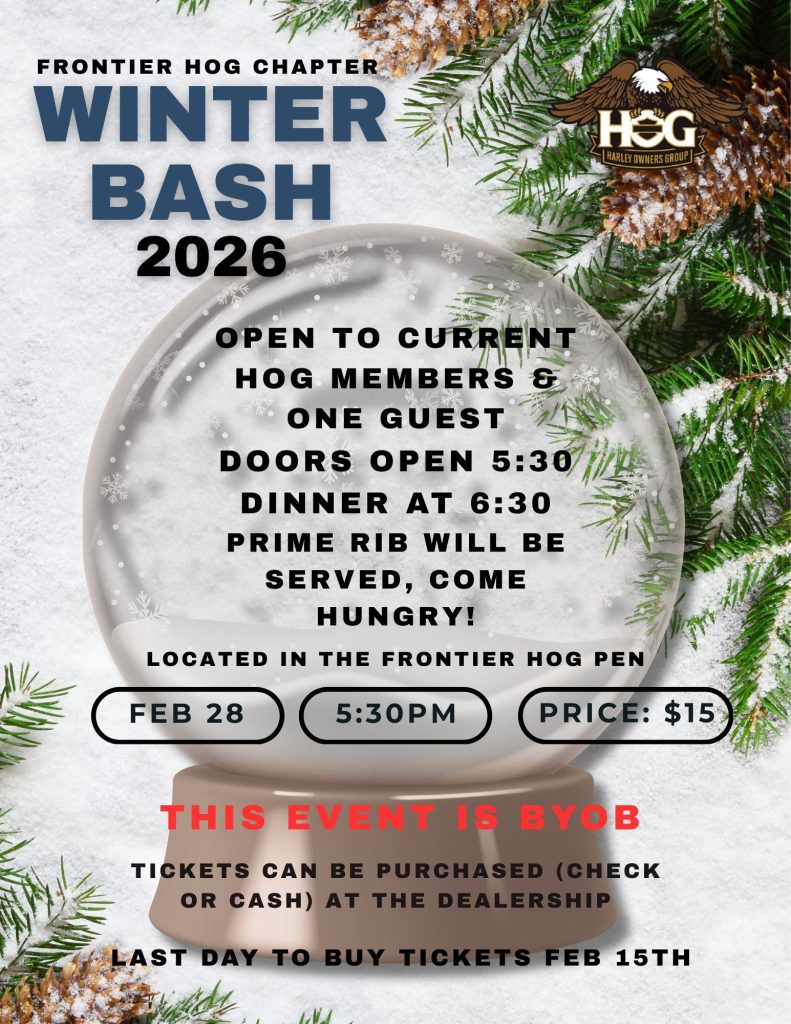 HOG events are now posted in the new Calendar Tab in the Frontier HOG website (Click Here) . We are posting dates of the events that we know about for the New Year. Most are firm. A few could change as stuff happens. Your "World's Greatest Webmaster" will add in details, times, etc. as they become available. We hope this helps with your long range planning!